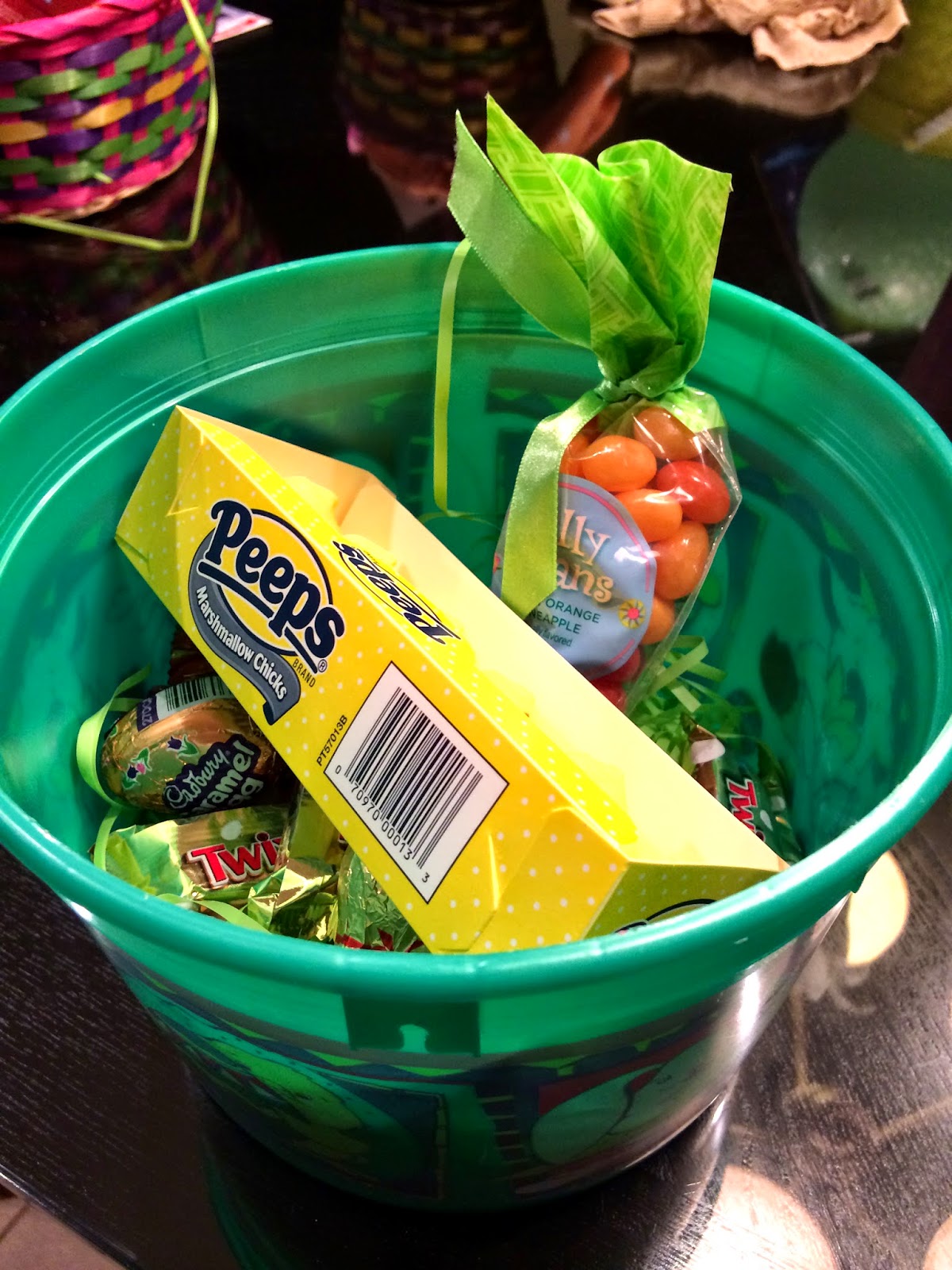 | Jesikah's basket. She got a coral polka dot shirt under the chocolate bunny |