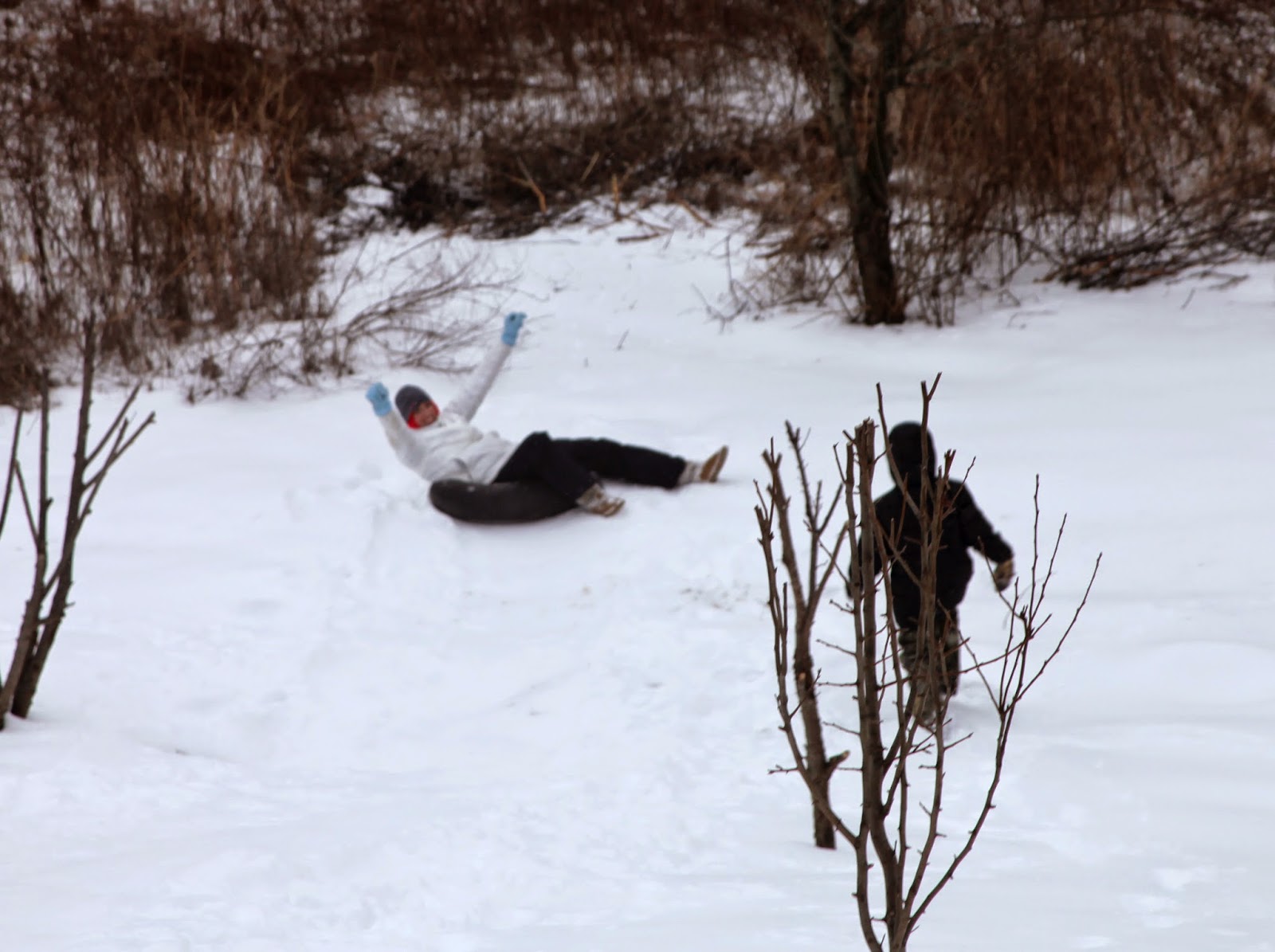 | Micah holding his car anxiously waiting for Eric to stand it up again to try out the finished tracks. |